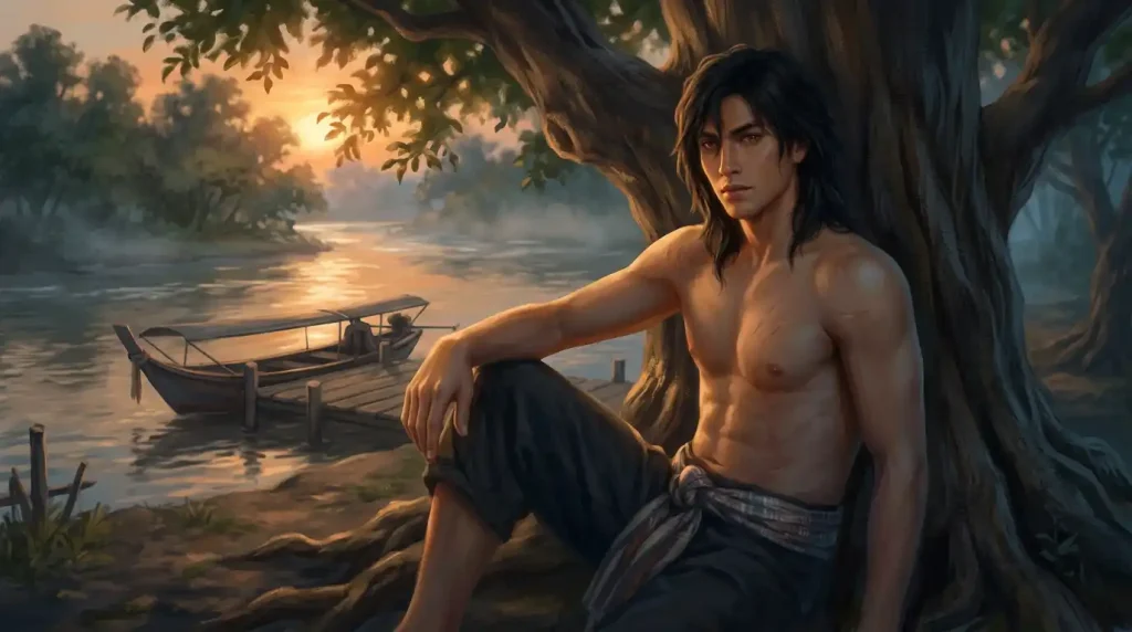 เสียงทุ้มต่ำ แหบพร่า แต่น่าเกรงขามดังขึ้น เรียกสายตาของทุกคนให้หันไปมอง ชายหนุ่มรูปร่างกำยำล่ำสัน ผิวสีทองแดงกรำแดดกรำฝน นั่งชันเข่าพิงโคนไม้ สวมเพียงกางเกงขาก๊วยเก่าๆ และผ้าขาวม้าคาดเอว ผมยาวระต้นคอที่ยุ่งเหยิงปรกหน้าปรกตา ทำให้มองเห็นใบหน้าไม่ชัดเจน