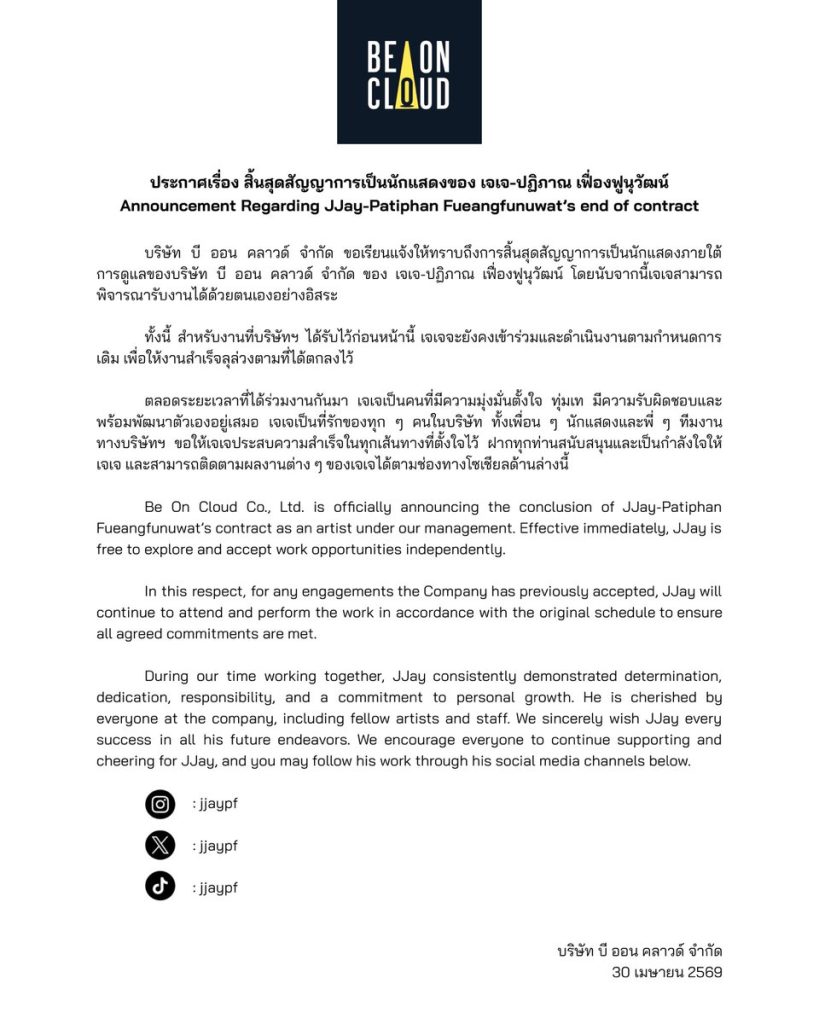 ถือเป็นข่าวใหญ่ที่ทำให้แฟนๆ หลายคนต้องหยุดฟัง เมื่อทาง Be On Cloud (BOC) ค่ายบันเทิงยักษ์ใหญ่ผู้อยู่เบื้องหลังความสำเร็จของซีรีส์วายระดับโลก ได้ออกมาประกาศยุติสัญญาการเป็นศิลปินภายใต้การดูแลกับ “เจเจ ปฏิภาณ เฟื่องฟูนุวัฒน์” อย่างเป็นทางการ โดยมีผลบังคับใช้ในทันที ซึ่งนับเป็นการตัดสินใจร่วมกันเพื่อเปิดโอกาสให้ศิลปินได้เติบโตในเส้นทางที่ต้องการ