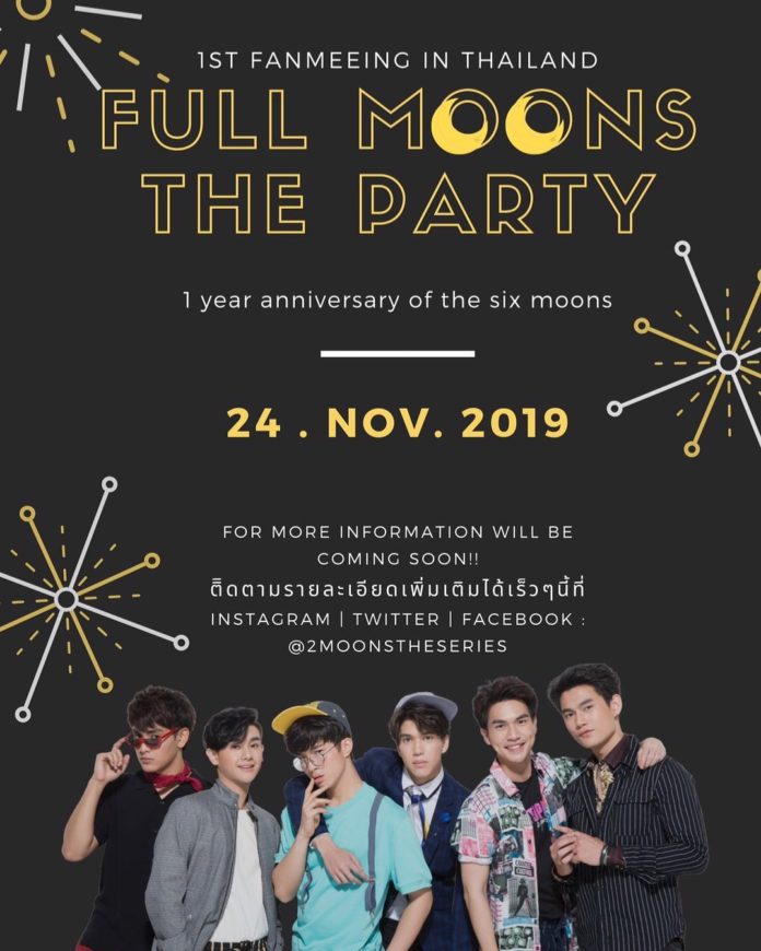 ” 24 พ.ย. 61 คือวันแรกที่พวกเราได้รู้จักกับเดือนทั้ง 6 ขอบคุณทุกคนมากๆนะคะที่สนับสนุนพวกเราจนมาถึงวันนี้😊 24 พ.ย. 62 จะครบ 1 ปีแล้วนะ เรามาฉลองกันเถอะ ในงาน “Full Moons The Party” 1st fanmeeting in Thailand of #TheSixMoons รายละเอียดเพิ่มเติมจะตามมาในเร็วๆนี้แน่นอนค่า🥳❤️”